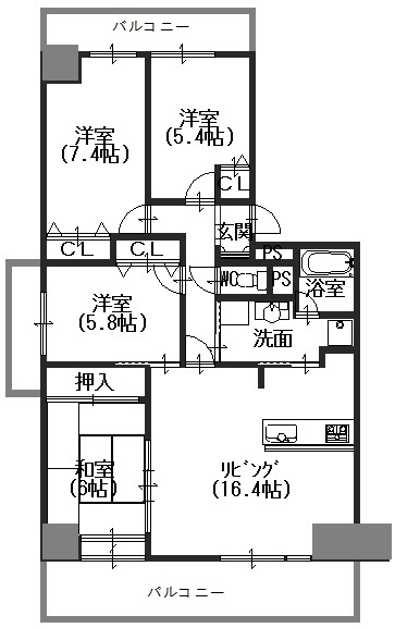 間取詳細LDK(16.4帖)・和室(6帖)・洋室(7.4帖)・洋室(5.8帖)・洋室(5.4帖)・洗面室・浴室・トイレ・バルコニー